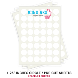 24 Frosting sheets with Pre-cut circulars of 1.25" A4 letter size! The pre-cut edible frosting circles can be printed on with edible image printers and edible cartridges. Each edible frosting sheet has a somewhat vanilla flavor.